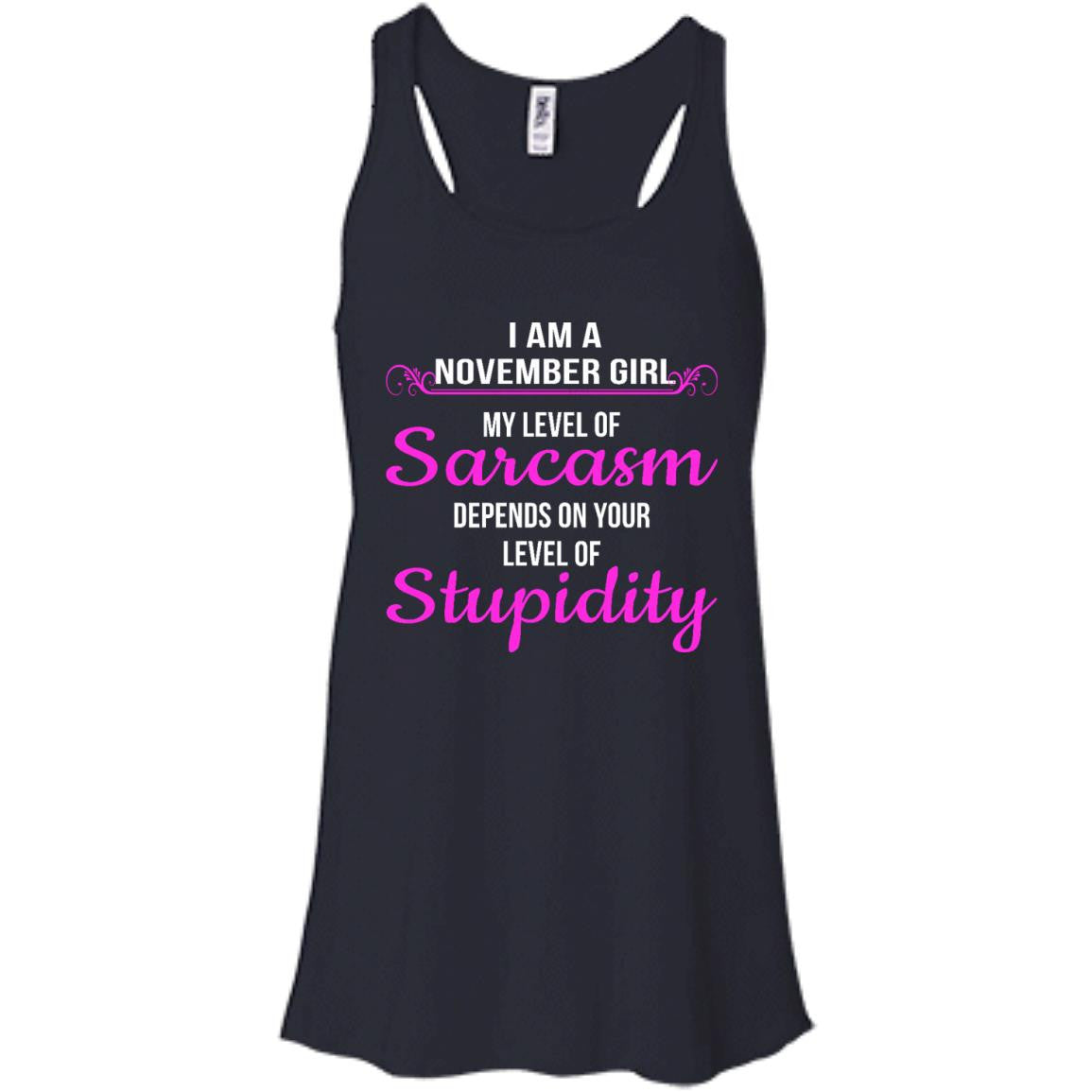 I am a November girl My level of sarcasm depends on your level of Stupidity shirt, tank top, hoodie, racerback.