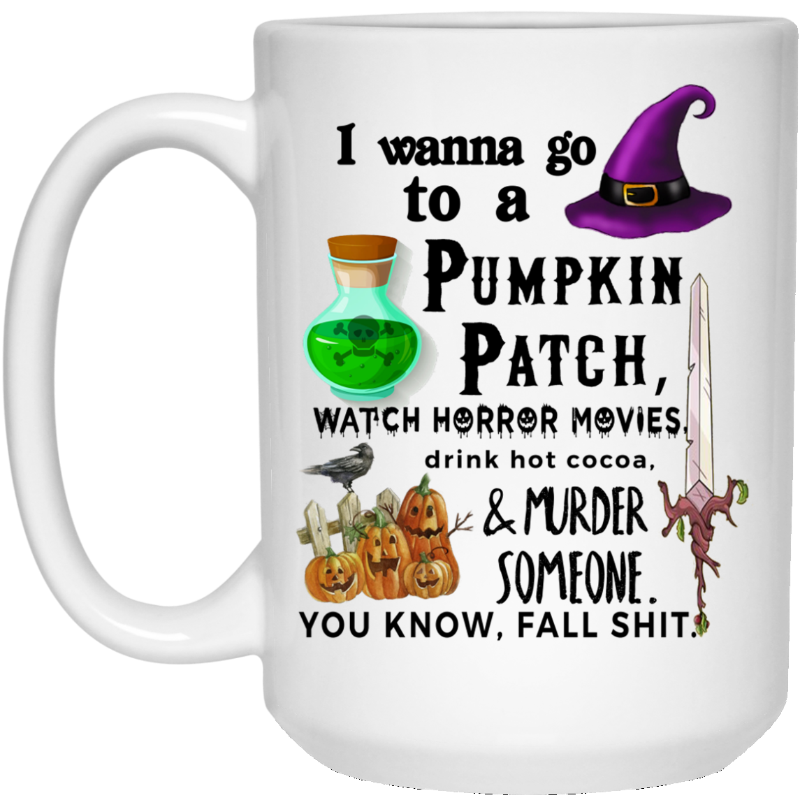 Halloween. I wanna go to a pumpkin patch watch horror movies, drink hot cocoa and murder someone. You know, fall shit mugs