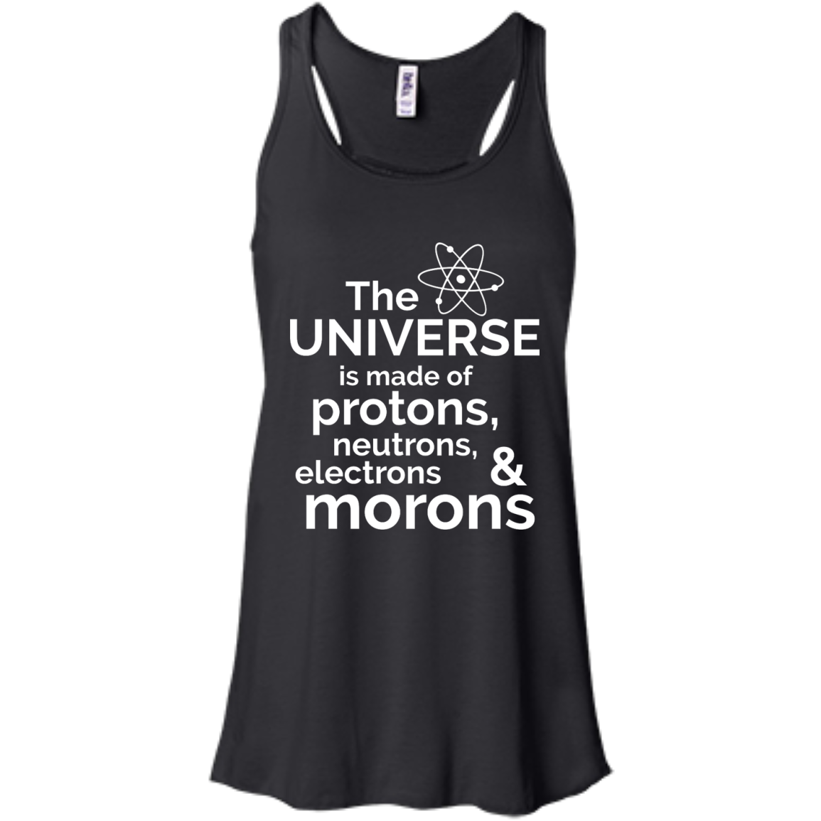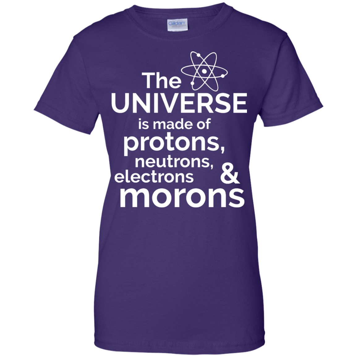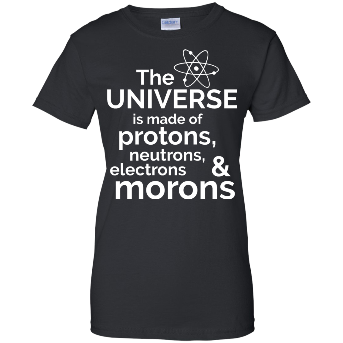 Funny Science Tee: The UNIVERSE is made of Protons, Neutrons, Electrons and Morons. Tees, racerbacks, hoodies available.