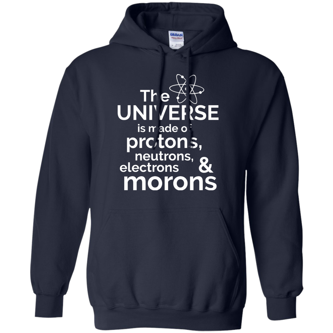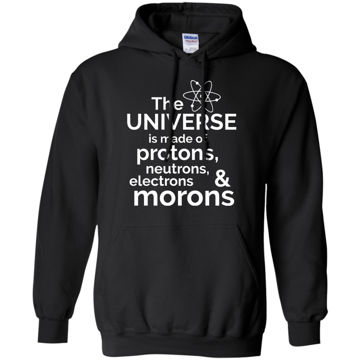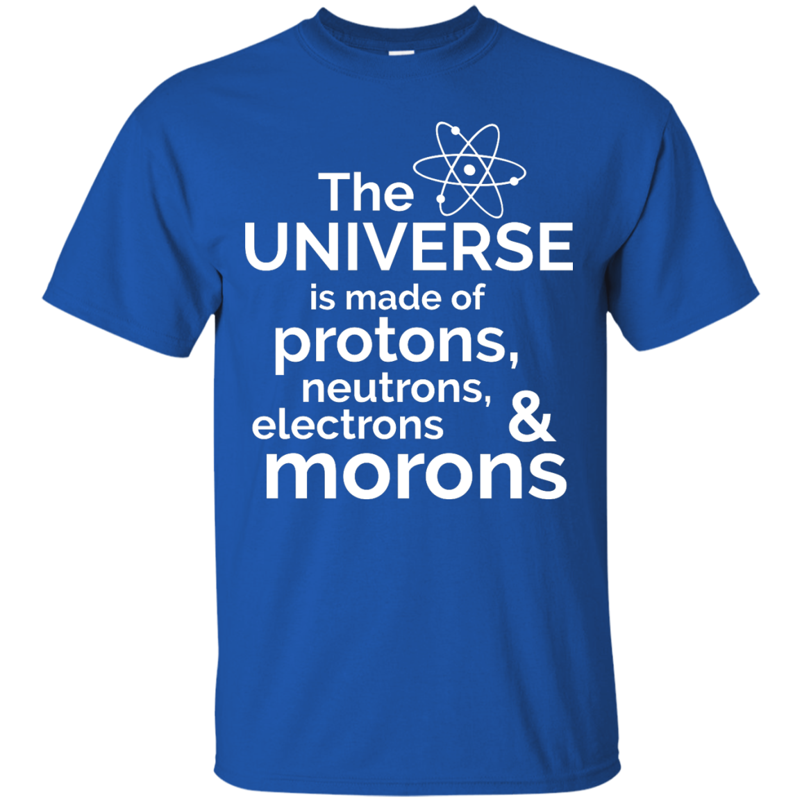 Funny Science Tee: The UNIVERSE is made of Protons, Neutrons, Electrons and Morons. Tees, racerbacks, hoodies available.